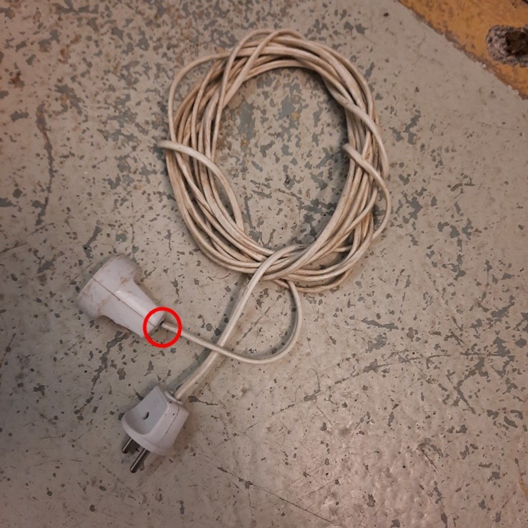 Jatkojohdon suojavaippa on kuvassa punaisella ympyröidystä kohdasta vetäytynyt paljastaen peruseristetyt johtimet suojavaipan alta. Peruseristettyihin johtimiin ei ole turvallista koskea (sähköiskun vaara).