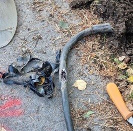 Kuva: Valokuitua kaivettaessa oli vahingoitettu sähköjohtoa ja teipillä korjattu vahinkokohta oli peitetty maan alle. Aiheutettu vahinko paljastui sähköyhtiön ryhtyessä selvittämään katuvalojen toimimattomuutta.