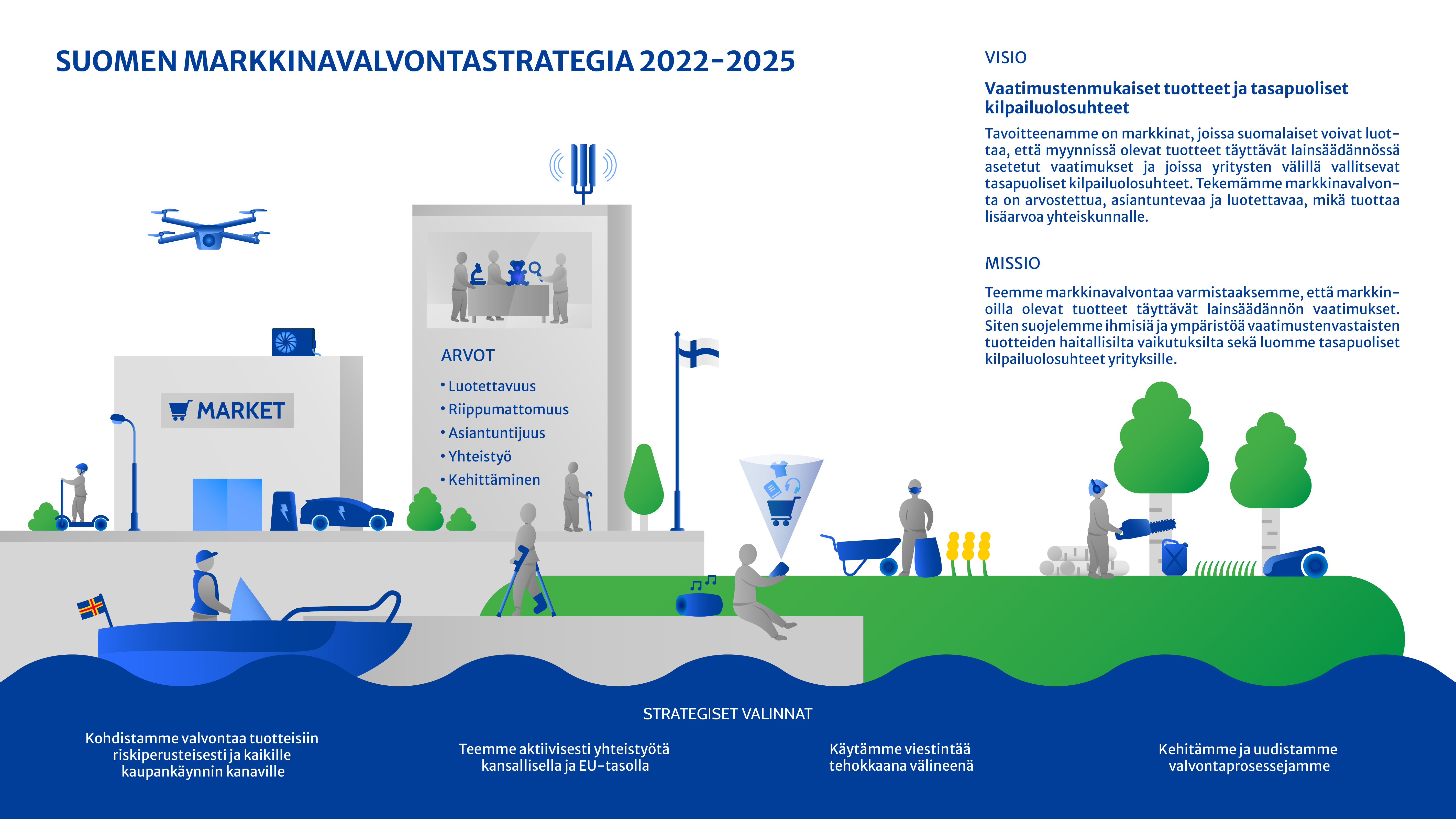 Suomen markkinavalvontastrategia 2022–2025 sisältää tavoitteet ja toimenpiteet vaikuttavan ja yhtenäisen kansallisen markkinavalvonnan sekä markkinavalvontaviranomaisten välisen yhteistyön aikaansaamiseksi kansallisesti ja EU-tasolla. Strategiassa esitetään Suomen markkinavalvontaviranomaisten yleiset toimintalinjat ja valvonnan painopistealueet, jotta markkinavalvonnalle asetetut tavoitteet saavutetaan ja käytössä olevien valvontaresurssien tehokkuus ja vaikuttavuus voidaan optimoida mahdollisimman hyvin.