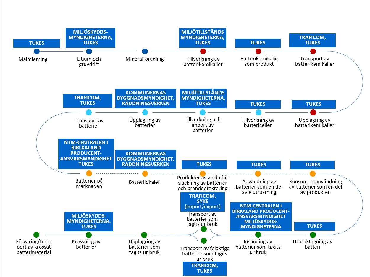 Myndighetsuppgifterna gäller i huvudsak tillstånd, övervakning, marknadsövervakning, övervakning av producentansvar inom avfallshanteringen, information och rådgivning. För att myndighetsverksamheten ska fungera smidigt, har Säkerhets- och kemikalieverket Tukes samt NTM-centralen i Birkaland effektiviserat sitt samarbete gällande litiumjonbatteriernas värdekedja. Målet för samarbetet är at tydliggöra myndighetsverksamheten gällande batteriindustrin och lyfta fram lagstiftningen gällande litiumjonbatterier. Om man granskar hela livscykeln för batteriernas värdekedja, omfattar helheten över 35 olika författningar eller författningsområden.
