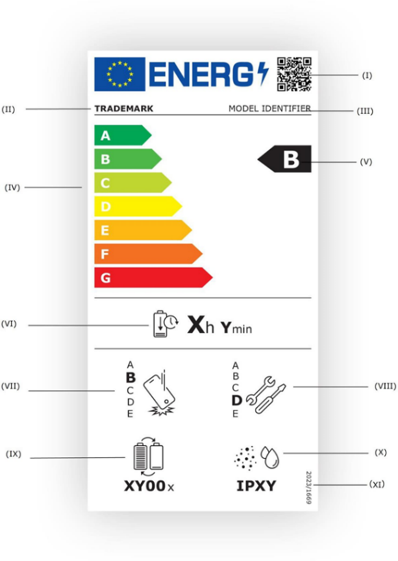 I) QR-kod, med vilken man kommer till databasen för energimärkta produkter (EPREL) för närmare uppgifter. Där hittar konsumenten förutom teknisk information även annan nyttig information, såsom en länk till en reparationsanvisning för slutanvändare samt till tillgängliga reservdelar.