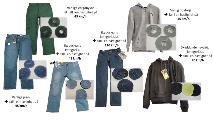 Bildtext: Tukes testades också vanliga kläder, varav de flesta slets ut helt i stötnötningstesterna. Vanliga jeans eller skyddskläder slets dock inte ut helt eller så slets endast ytskiktet på dessa.