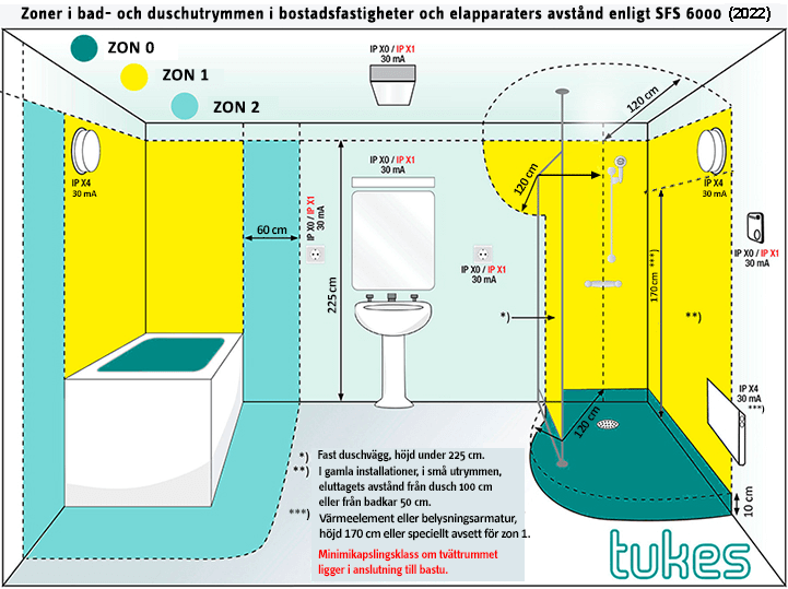 Placeringen av elapparater i omedelbar närhet av dusch eller badkar har begränsats genom indelning i zonerna 0, 1 och 2. Man måste ta hänsyn till zonerna när nya elapparater installeras eller om duschen eller badkaret flyttas. Zonernas allmänna egenskaper och de vanligaste kraven på zonindelningen visas i bilden nedan.